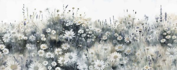 Une prairie de fleurs vivante avec des teintes de vert étincelantes, où les marguerites et la lavande semblent tout juste s'éveiller de la rosée du matin. Les couleurs fraîches et les coups de pinceau doux créent une atmosphère optimiste et naturelle qui égaye chaque pièce.