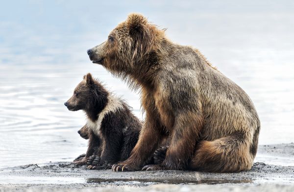 Une ourse avec son ourson près de l'eau. Les profils sont réalisés par le photographe Giuseppe Damico.