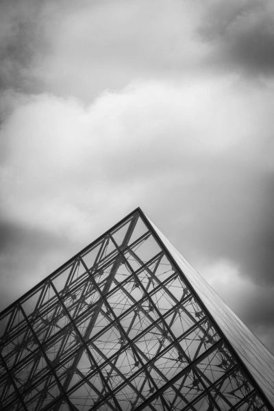 Un pointe de pyramide en verre tranchante se détache sur un ciel dramatique de nuages. Le jeu de lignes et de reflets met en valeur le minimalisme moderne et la force architecturale.