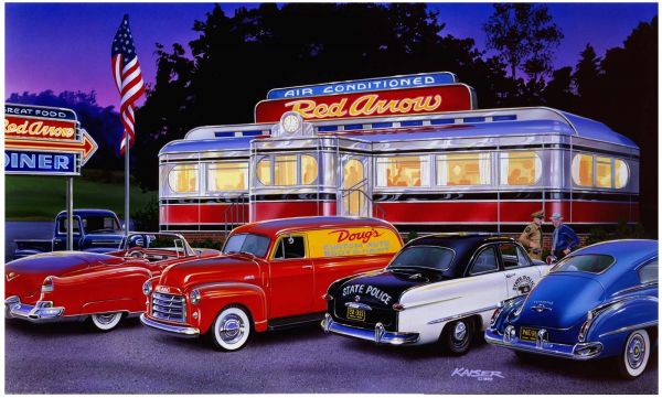 Cette image vous transporte dans une soirée nostalgique au classique "Red Arrow Diner", où le charme rétro et le style vintage se rencontrent.