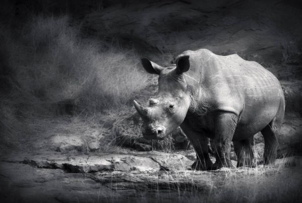 Papier peint avec une image en noir et blanc d'un rhinocéros dans la nature sauvage