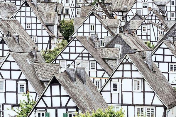 Ce design frappant montre un fascinant réseau de maisons à colombages traditionnelles, telles qu'on les trouve dans les villages historiques en Allemagne ou dans les Ardennes. Les façades se composent d'un motif serré de poutres en bois noires et de plâtre blanc, alternant avec des toits en ardoise dans des tons de gris. L'image semble presque abstraite en raison de la répétition des lignes de toit pointues, des fenêtres carrées et des éléments diagonaux, tout en dégageant chaleur et patrimoine. Le choix de couleurs est pur et discret : le noir, le blanc et les tons de gris naturels dominent, créant ainsi une atmosphère de calme et d'ordre. Les volets verts ou les cheminées apportent des touches subtiles sans perturber l'ensemble. La densité des maisons crée un motif rythmique à la fois vivant et équilibré. Idéal pour les styles d'intérieur modernes-classiques et éclectiques, où les lignes épurées et les éléments historiques se complètent. Associez ce design à des matériaux naturels tels que le bois, l'ardoise ou le lin, et ajoutez des accents de vert mousse, de jaune ocre ou de rouge profond pour apporter de la chaleur. Dans un intérieur minimaliste, le motif peut servir de point focal sans ajouter de couleur. Parfait comme mur d'ambiance dans un salon, un couloir, une salle à manger ou un espace de travail à domicile plein de caractère. Dans un hôtel, un restaurant ou une boutique, ce design ajoute une dimension culturelle sans être envahissant. Avec sa structure répétitive, ses couleurs neutres et ses détails artisanaux, ce design est un hommage intemporel à l'architecture européenne, offrant un effet graphique surprenant qui apporte à la fois calme et caractère à l'espace.