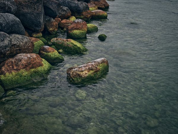 Roches au lac de montagne en différents matériaux