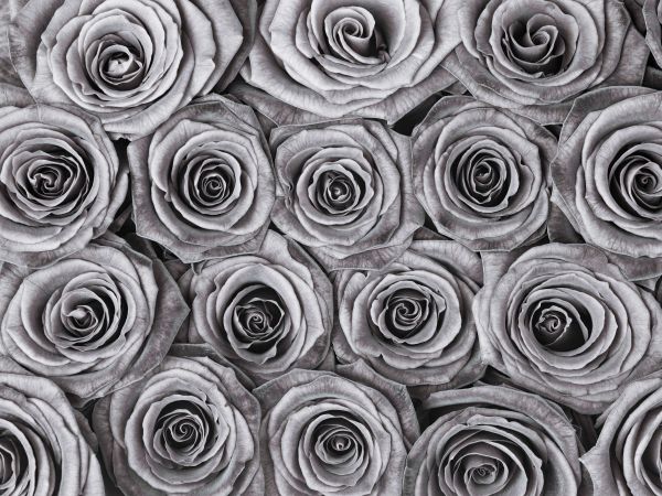 Un champ de roses est transformé en une palette de gris, célébrant l'essence de leur forme. Les délicates gradations de lumière et d'obscurité révèlent la texture veloutée des pétales et les motifs hypnotiques qu'ils forment. Cette image invite à la contemplation et à l'admiration de la géométrie naturelle.