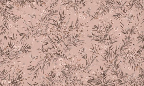 Les oiseaux tendres volettent entre les fleurs et les branches sur un fond rose ancien chaud. Les tons terreux doux donnent à ce motif une allure rêveuse, classique et romantique avec une élégance naturelle.