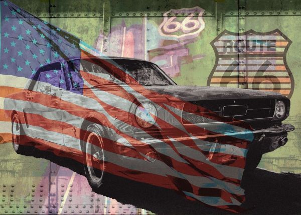 Une œuvre d'art inspirée du vintage qui combine une voiture classique avec des symboles américains iconiques tels que les panneaux de la Route 66 et le drapeau des États-Unis. Le design dégage de la nostalgie et de la liberté.