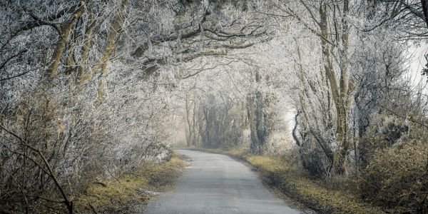 Route gelée à travers la forêt un jour d'hiver. Avec ce papier peint dans la maison, c'est comme si on pouvait marcher sur la route.