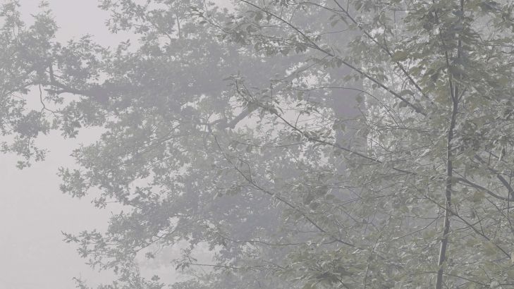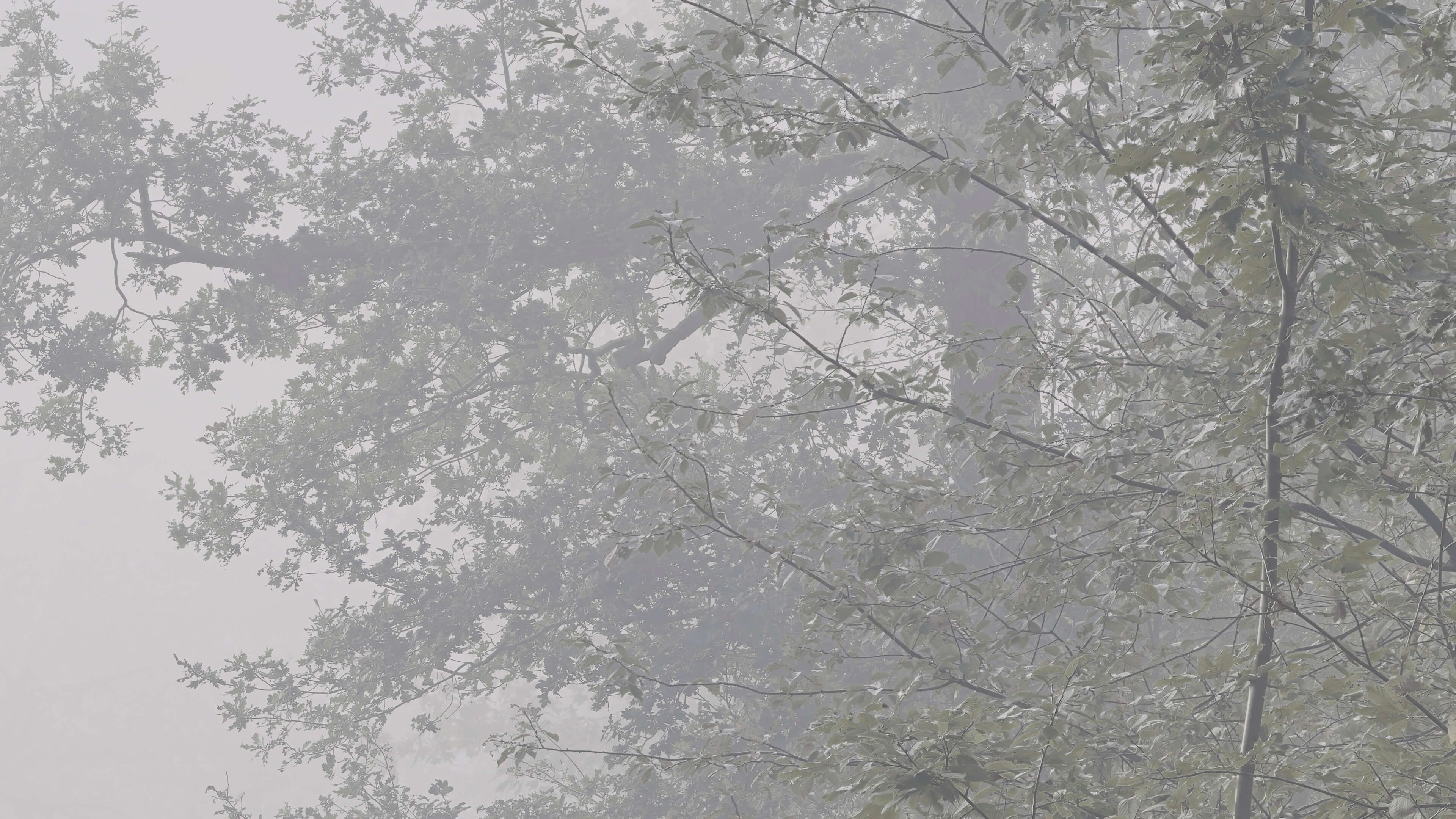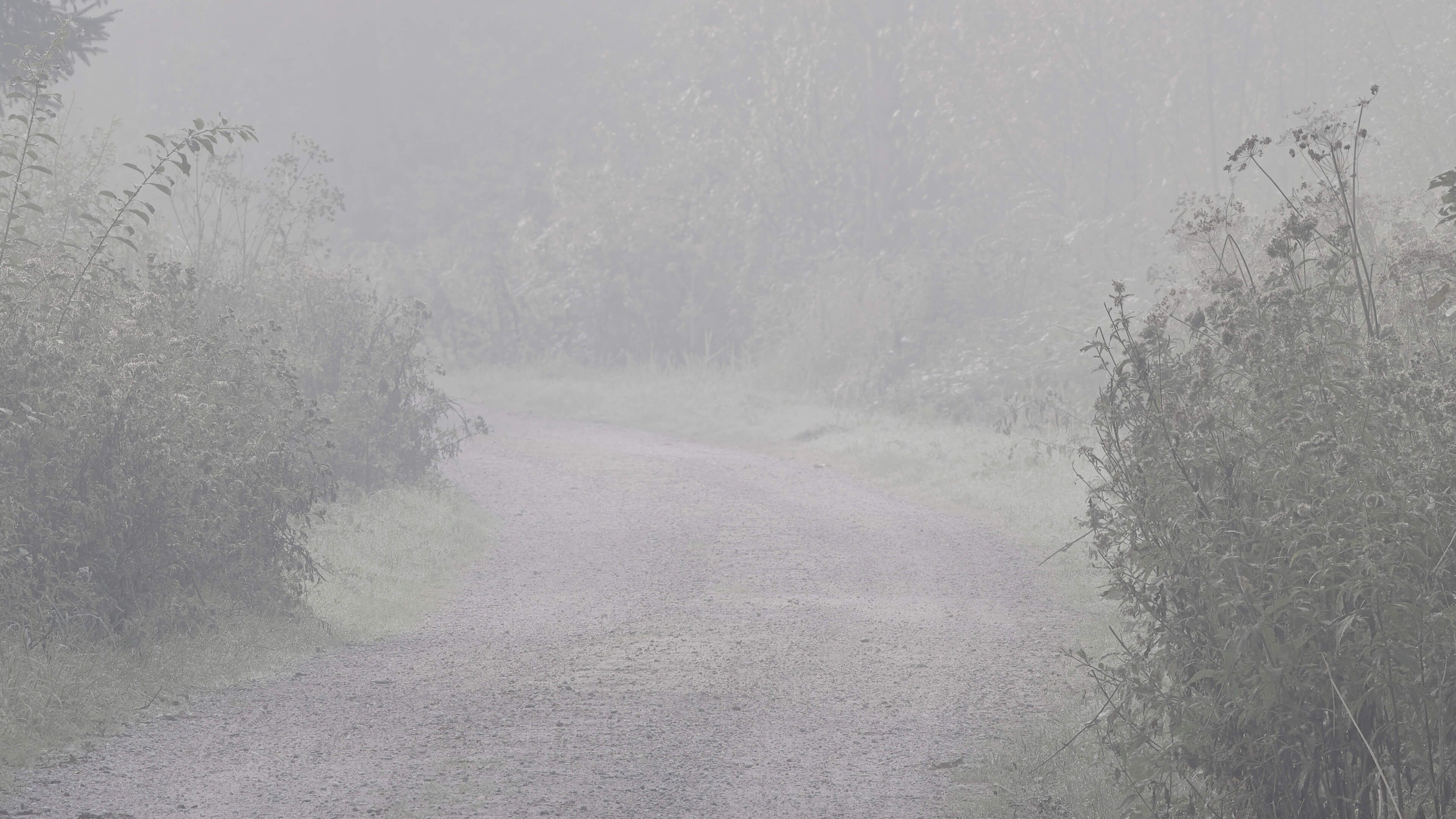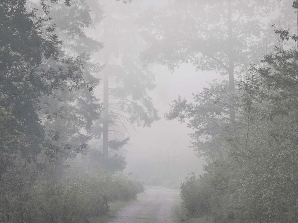 Une route étroite à travers une forêt brumeuse pleine de beaux arbres. La forêt semble mystérieuse à cause de la brume.