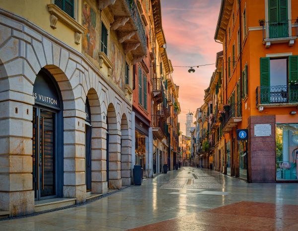 Rue commerçante au lever du soleil