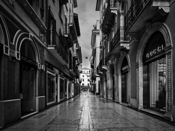 Rue commerçante en noir et blanc en différents matériaux