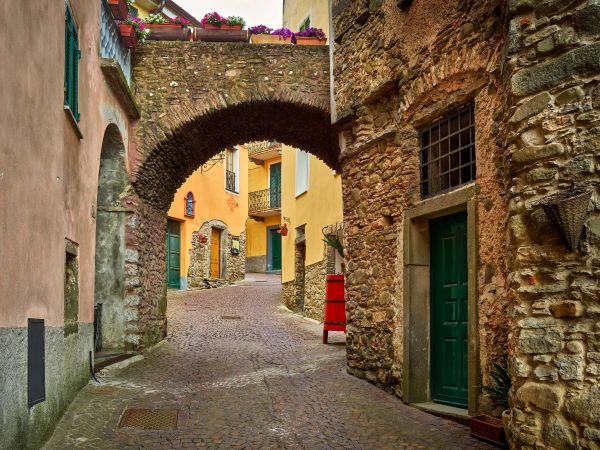 Rue pavée avec arches en différents matériaux