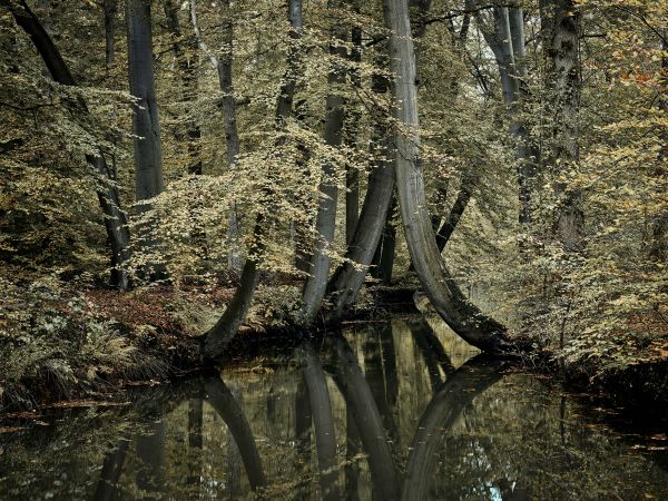 Un beau ruisseau avec des arbres inhabituels suspendus au-dessus de l'eau. Combinez ce papier peint dans le salon, par exemple.