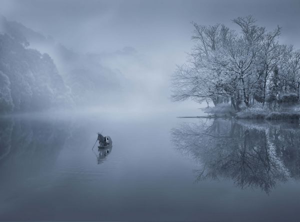 Faire de la barque direction le brouillard sur un lac désert par une froide journée d'hiver.