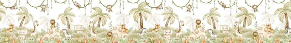Cette illustration de jungle amicale apporte une atmosphère chaleureuse et ludique dans chaque pièce d’enfant. Entre de doux palmiers dessinés et des lianes vertes, de jolis animaux comme des lions, des girafes, des éléphants, des zèbres, des tigres, des singes et un paresseux jouent et se reposent. Les animaux ont une apparence adorable et adaptée aux enfants et sont dispersés dans un paysage rêveur de vert pastel, beige et nuances de sable. La palette de couleurs est douce et naturelle, avec beaucoup de tons crème chauds, du vert clair et une touche d’orange subtile. Cela irradie le calme, tandis que la composition ludique et les silhouettes animales joyeuses apportent vitalité et convivialité. Idéal pour une chambre de bébé ou une chambre d’enfant où la sécurité et la joie sont au centre. Associez ce design avec des meubles en bois dans des teintes claires, des textiles beiges ou menthe, et des accessoires jungle tels que des feuilles, des paniers ou des peluches. Même associé à un tipi, un coin lecture ou un tapis de jeu, l’ensemble renforce le sentiment d’un monde fantastique d’aventure mais sûr. Le style d’illustration est rond et doux, avec des formes simples et des expressions faciales bienveillantes. Cela rend le design accessible dès le plus jeune âge, tout en restant visuellement attractif à mesure que les enfants grandissent. La composition aérienne et la répétition des formes apportent du calme au mur, sans être monotonnes. Un design parfait pour ceux qui recherchent une jungle tendre et féérique remplie d’êtres animaux imaginatifs.