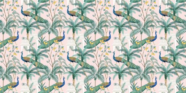Des paons gracieux paradent fièrement parmi des palmiers luxuriants et des agrumes, leurs plumes colorées formant un contraste éclatant avec le rose doux de l'arrière-plan. Cette scène respire un charme exotique, plein de vie et de grâce naturelle.