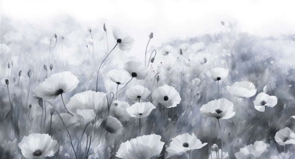 Des coquelicots blancs qui se dessinent doucement sur un fond pastel bleu frais. Les coups de pinceau subtils et les dégradés de couleurs clairs donnent une apparence fraîche, presque aérienne, parfaite pour un intérieur calme et lumineux.