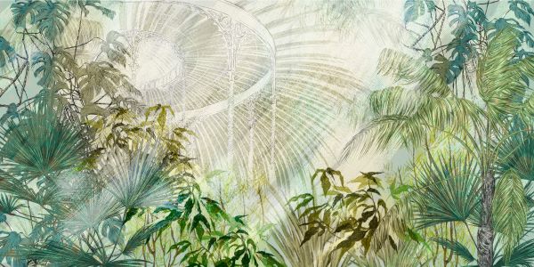 Papier peint d'un dessin d'une verrière avec des plantes tropicales. Combinez-les dans la chambre pour plus d'ambiance.