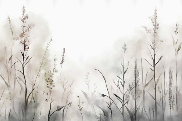 Des herbes sauvages et des fleurs dans des tons de gris neutres créent une apparence minimaliste et raffinée. La technique de l'aquarelle donne au design une atmosphère douce et rêveuse, idéale pour un intérieur sobre et élégant.