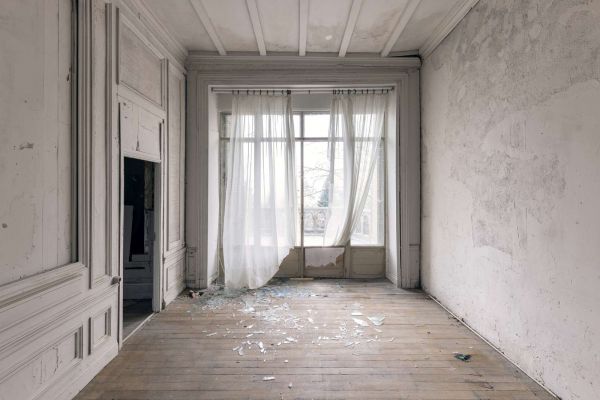 L'ancienne galerie des glaces d'un château abandonné en France. Le jour de notre visite, un silence-ii inquiétant régnait. Ce bâtiment a connu une histoire mouvementée. Il a été tour à tour résidence privée, hôpital militaire pendant la Première Guerre mondiale, sanatorium et enfin centre de formation avant d'être complètement abandonné il y a une quinzaine d'années.