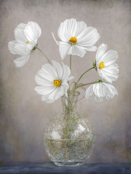 Simply Cosmos Flowers est une nature morte de fleurs blanches dans un vase en verre. Grâce à ses couleurs calmes, vous pouvez facilement combiner ce papier peint dans votre maison.