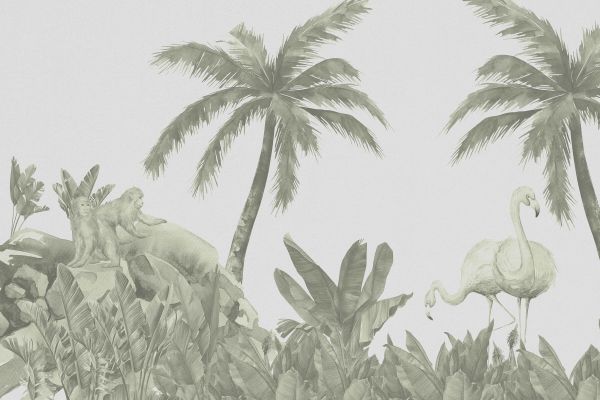 Papier Peint Panoramique Singes et flamants roses en vert d'eau