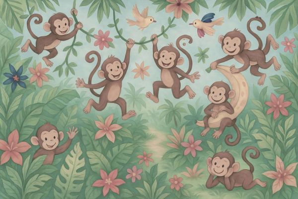 Cette scène de jungle tropicale déborde de gaieté. Huit singes espiègles sautent, se balancent, se cachent entre les feuilles et se détendent sur une banane, tandis que des fleurs colorées et des oiseaux chantants donnent vie à l'ensemble. L'arrière-plan est lumineux et ouvert, avec un ciel bleu clair et un sentier serpentant à travers la jungle luxuriante, maintenant l'image non seulement vivante mais aussi spacieuse. La palette de couleurs est joyeuse et ludique : différentes nuances de vert dominent le feuillage, tandis que des fleurs dans des tons de rose doux, corail, orange et bleu profond apportent des accents joyeux. Les singes sont dessinés dans des tons bruns chauds et ont des visages expressifs et souriants qui donnent à l'ensemble un charme espiègle. Les petits oiseaux jaune pastel et bleu ajoutent du mouvement et de la couleur. Parfait pour une chambre d'enfant sur le thème de la jungle, tropical ou aventureux. Ce design se marie particulièrement bien avec une pièce contenant des éléments ludiques tels que des plantes suspendues, des meubles en rotin, des étagères murales en forme de feuilles et des lampes décoratives en forme d'animaux. Associez-le à des textiles dans des tons frais comme le vert menthe, le rose saumon ou le jaune soleil pour prolonger l'ambiance joyeuse. Idéal pour un coin jeu, une chambre de tout-petit joyeuse ou en tant qu'élément central derrière le lit. Les singes amicaux et la composition ludique rendent ce design adapté aux jeunes enfants, sans agitation visuelle. Il invite au jeu, à l'imagination et à d'innombrables histoires sur des singes espiègles et des aventures tropicales.