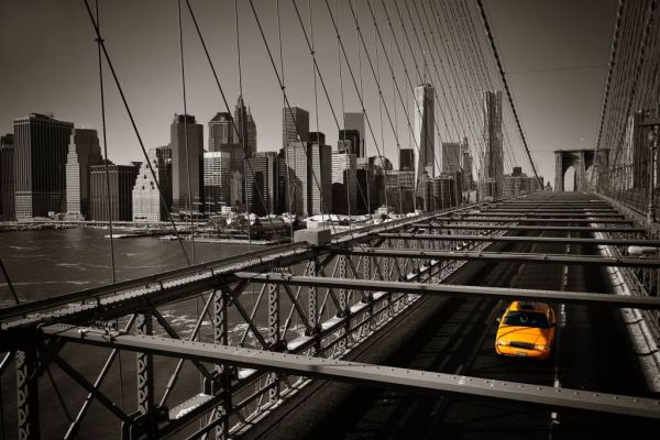 Papier peint noir et blanc de l'horizon de Manhattan vu d'un pont avec un taxi jaune au premier plan.