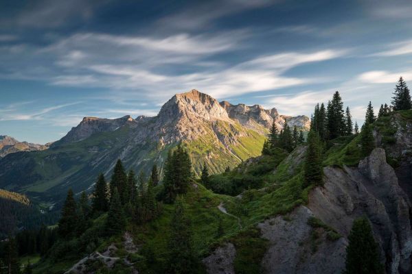 Un massif montagneux imposant est doucement éclairé par le soleil du soir, avec des pentes vertes et des forêts de pins sombres en premier plan. Les nuages allongés donnent à l'ensemble une dynamique rêveuse.