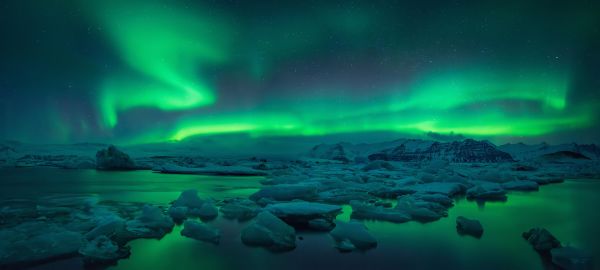 Les aurores boréales au-dessus d'un paysage de glace en Norvège.