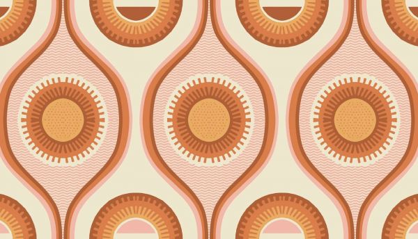 Un motif vivant et ondulant de soleils stylisés dans des tons orange chauds, terracotta et jaune doux. Le motif répétitif et les formes rondes donnent une sensation rétro prononcée avec une énergie moderne.