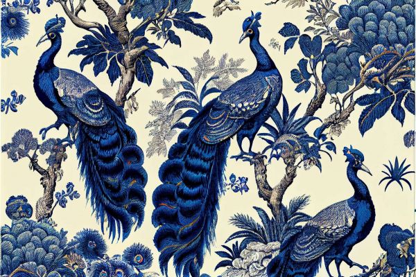 Ce design est un exemple d'élégance royale, où le paon, avec son plumage bleu luxuriant et sa posture majestueuse, est au centre. La représentation détaillée des plumes, ainsi que les nuances subtiles de bleu et les accents dorés, créent une atmosphère de splendeur luxueuse. La flore dans le design offre un fond gracieux qui complète la grandeur naturelle de ces oiseaux.