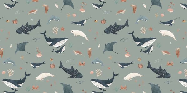 Un motif sous-marin joyeux avec la vie marine comme des baleines, des raies manta, des dauphins et des tortues de mer, au milieu de coraux colorés et d'étoiles de mer. L'arrière-plan doux et les illustrations ludiques créent une atmosphère calme et aventureuse, idéale pour créer un accent vivant dans n'importe quel espace.
