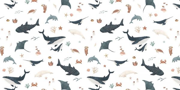 Un motif sous-marin joyeux avec la vie marine comme des baleines, des raies manta, des dauphins et des tortues de mer, au milieu de coraux colorés et d'étoiles de mer. L'arrière-plan doux et les illustrations ludiques créent une atmosphère calme et aventureuse, idéale pour créer un accent vivant dans n'importe quel espace.