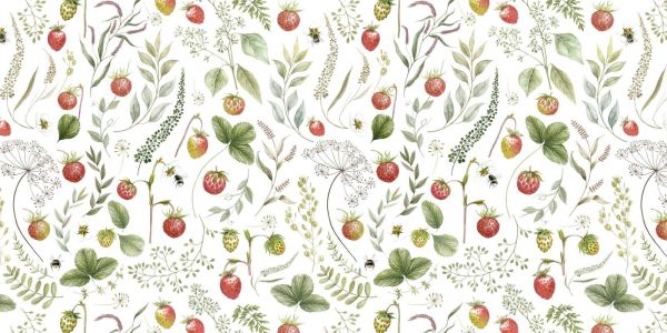 Un motif vivant avec des fraises mûres, des feuilles et des fleurs, accompagné d'abeilles espiègles, sur un fond blanc. Les illustrations détaillées et les couleurs fraîches apportent une ambiance estivale et naturelle, idéale pour ajouter une touche joyeuse et ludique à n'importe quel espace.