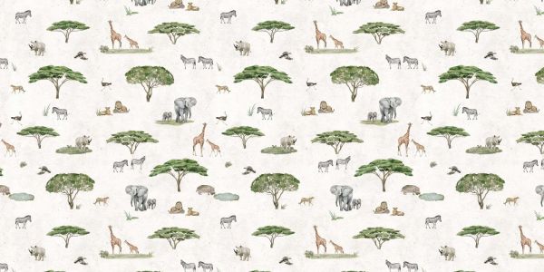 Un motif de savane ensoleillé avec des animaux sauvages tels que des girafes, des éléphants, des lions et des zèbres, dispersés entre des acacias et des prairies ouvertes. L'arrière-plan et les illustrations détaillées évoquent la chaleur et l'immensité de la savane africaine, idéales pour une ambiance aventureuse et naturelle dans n'importe quel espace.