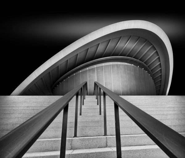 Papier peint du lever du soleil. Une photo en noir et blanc d'un escalier avec un bâtiment asymétrique au-dessus.