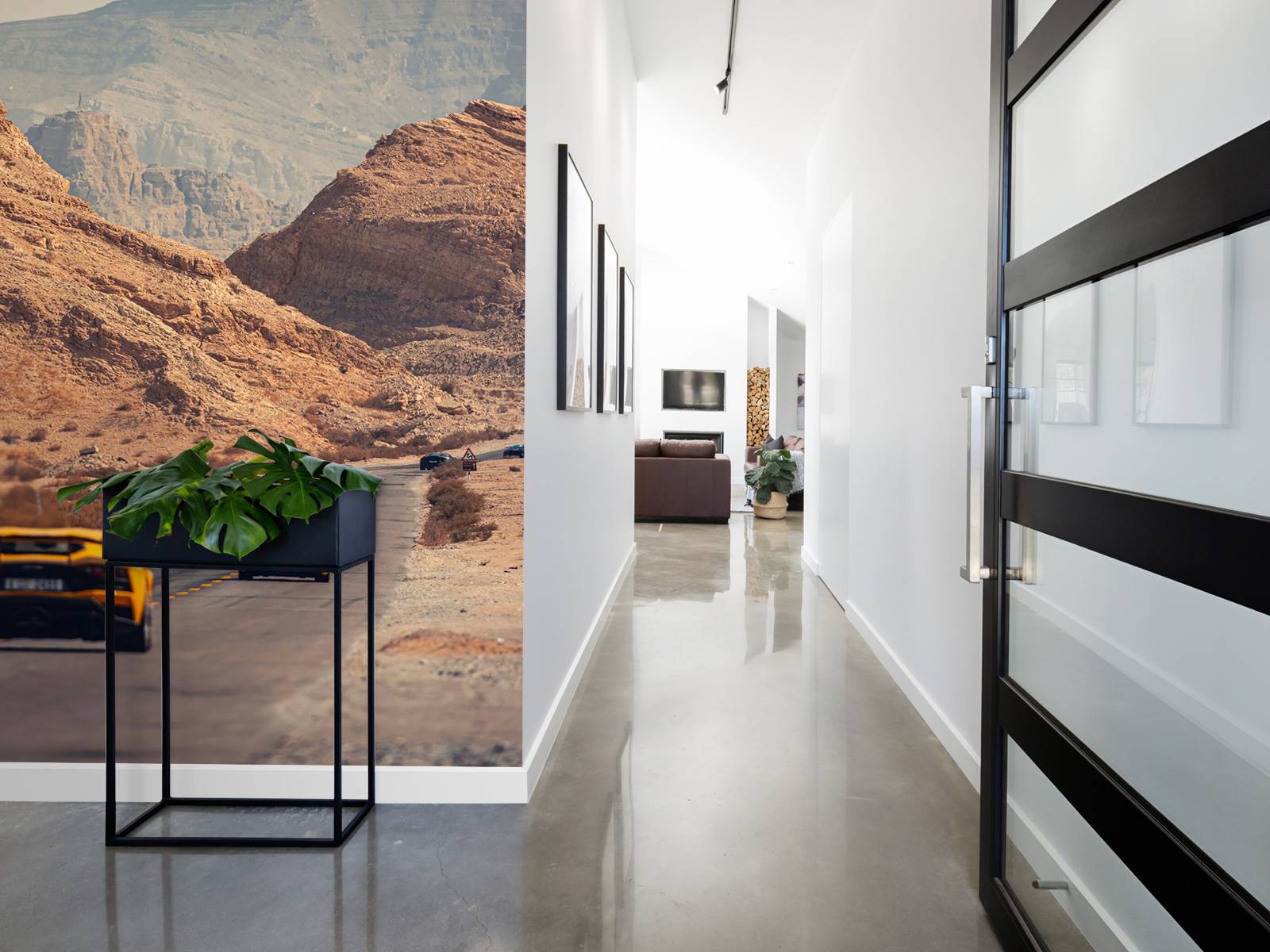 Associez ce design à des teintes terreuses et neutres pour mettre en valeur les couleurs chaudes du paysage. Des accents métalliques et un éclairage industriel peuvent renforcer l'apparence robuste. Pour une touche de luxe, des meubles en cuir et des accessoires dorés subtils peuvent être ajoutés, complétant parfaitement l'apparence exclusive des supercars. Ce design est idéal pour les amateurs de voitures exotiques, de road trips et de la beauté sauvage de la nature.
