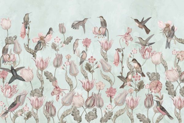 Papier Peint Panoramique Symphonie des Colibris de Printemps - Prairie de Menthe