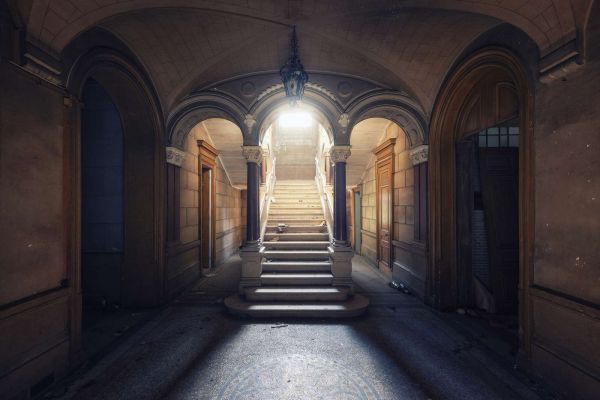 Le magnifique escalier d'un beau château en France. Anciennement intégré à un domaine viticole, il a récemment été le théâtre de nombreuses fêtes illicites et de raves. Heureusement, l'architecture a bien résisté et il est actuellement en cours de rénovation.