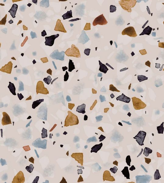 Ce design abstrait est une interprétation moderne du motif classique en terrazzo. Il combine des fragments organiques dans des couleurs terreuses telles que l'or et le brun avec des accents plus frais en bleu et noir. La légèreté des formes est équilibrée par un fond doux et neutre, ce qui donne au design une sensation à la fois dynamique et élégante.