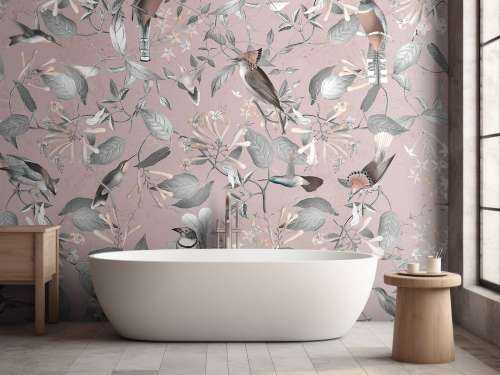 Un design ludique et élégant avec des oiseaux colorés au milieu de feuilles élancées et de fleurs délicates, parfait pour remplir un espace d'une touche d'harmonie naturelle et de raffinement.