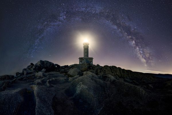 Papier peint d'un phare lumineux la nuit sous un magnifique ciel étoilé.