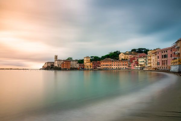 La ''Silence bay'' montre une plage déserte pendant une journée nuageuse. Les maisons colorées rendent ce papier peint atmosphérique.