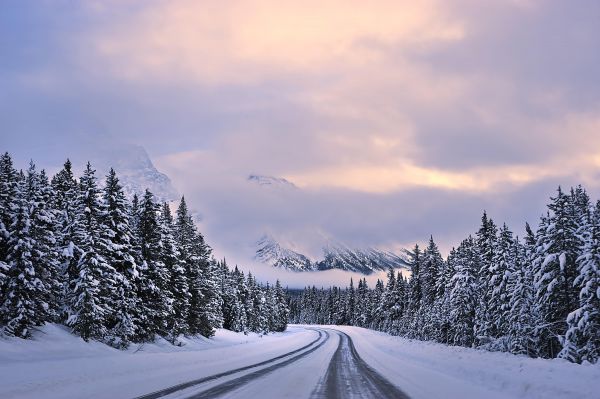 Une autoroute parmi de magnifiques arbres couverts de neige. On peut également voir des montagnes à travers les nuages.