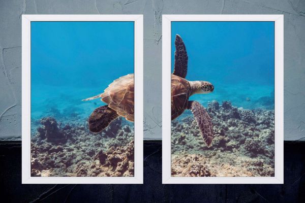 Une tortue de mer gracieuse flotte au-dessus d'un récif corallien coloré dans des eaux océaniques d'un bleu éclatant. La composition en diptyque donne une sensation sous-marine dynamique et vivante.