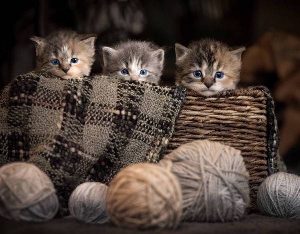 Trois adorables chatons dans un panier sur papier peint. De belles couleurs chaudes et au premier plan des boules de laine avec lesquelles les chatons peuvent jouer.