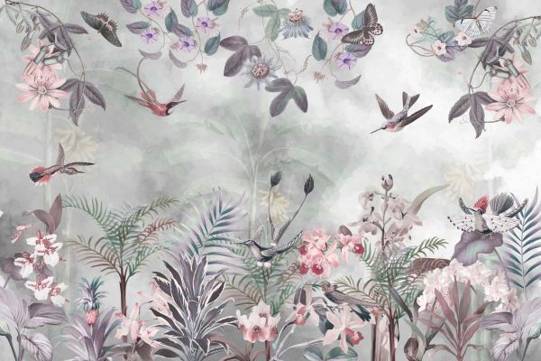 Ce design capture l’essence d’un paradis tropical, où beauté naturelle et sérénité se rejoignent. Des fleurs exotiques telles que des orchidées et des fruits de la passion fleurissent au milieu de palmiers luxuriants et de diverses feuilles vertes. Les colibris flottent gracieusement dans les airs, entourés de papillons subtils qui dansent délicatement parmi les fleurs. La palette de couleurs, composée de tons pastel doux et d'accents vifs, souligne à la fois une atmosphère fraîche et détendue.