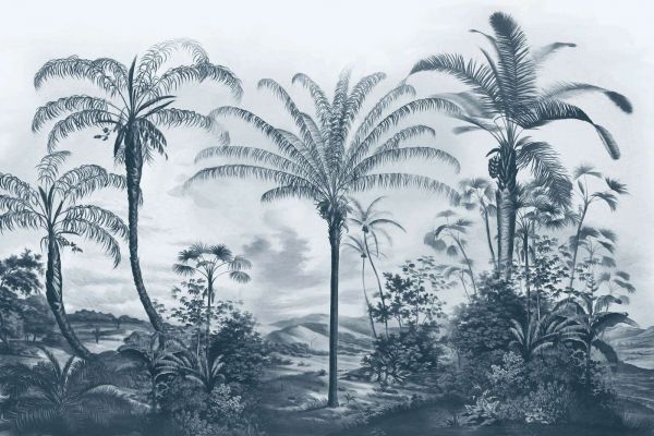 Des palmiers tropicaux baignés dans des teintes de bleu frais, variant du turquoise doux au bleu océan profond. L'arrière-plan rafraîchissant avec des collines ondulantes et des nuages légers respire une atmosphère calme et balnéaire.