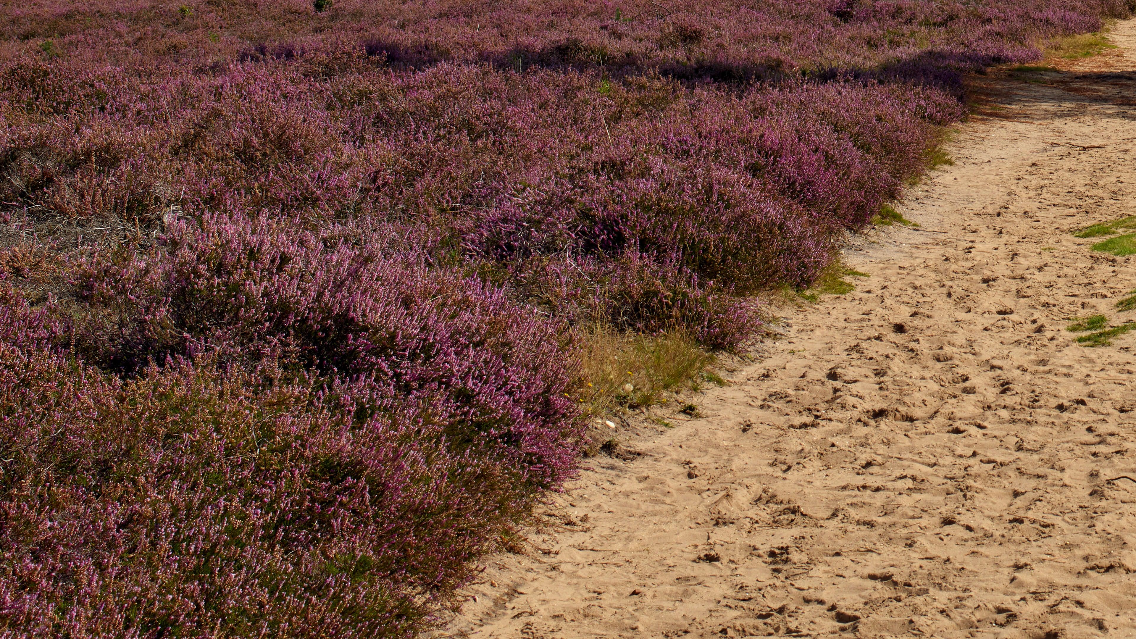 Arbre le long d'un chemin sablonneux dans la bruyère. Apportez la bruyère dans votre maison avec ce papier peint.