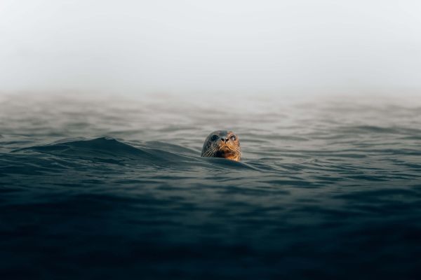 Un phoque au large des côtes danoises. À travers la tête du phoque, on peut voir que le soleil se couche.